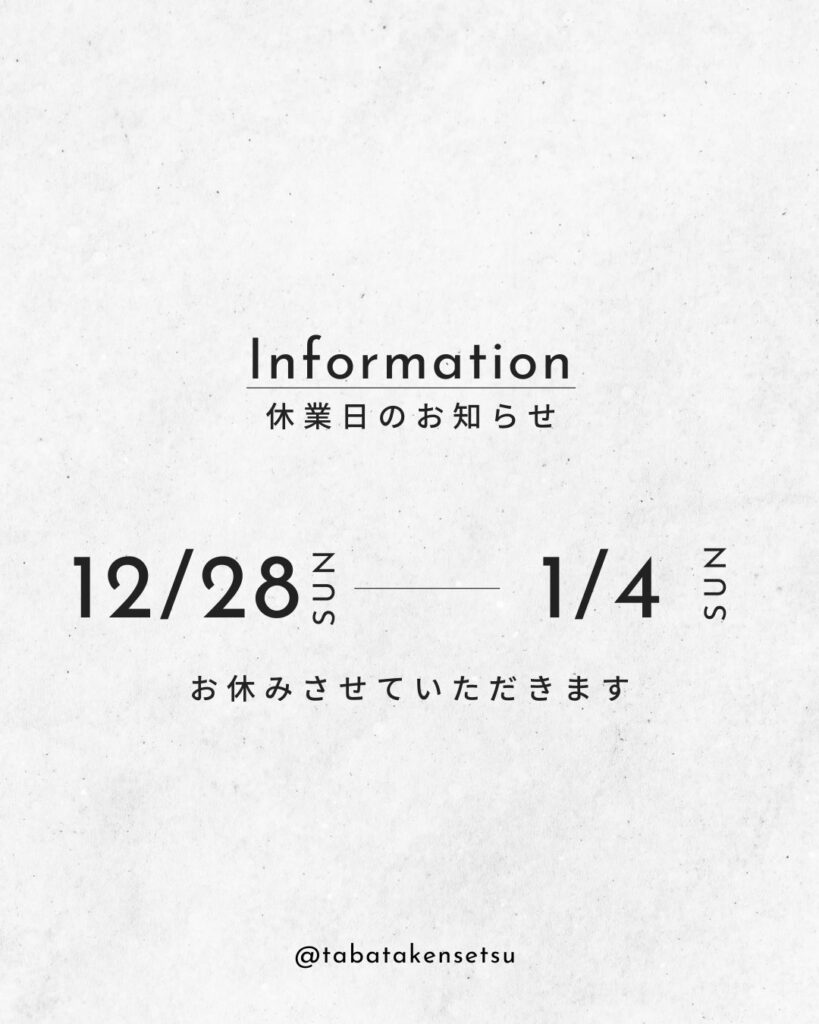 お休み期間中はメール・ホームページ・FAX・LINE・InstagramのDMからのお問合せの受付は行います。対応は1/5(月)以降となりますので、あらかじめご了承下さいますようお願い申し上げます。